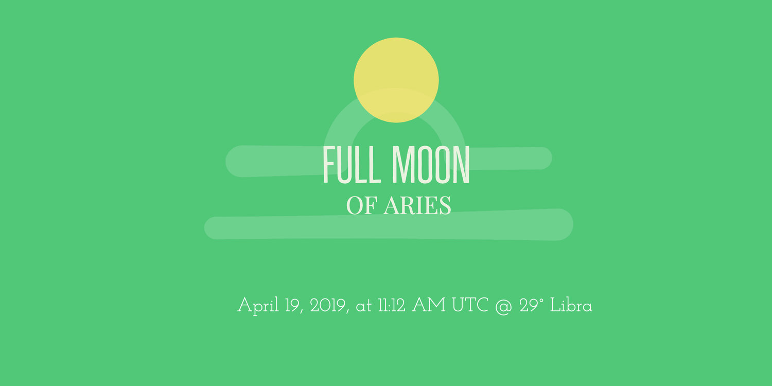 This Full Moon will be on April 19, 2019, at 11:12 AM UTC @ 29° Libra just an hour or so before the Moon moves into Scorpio.