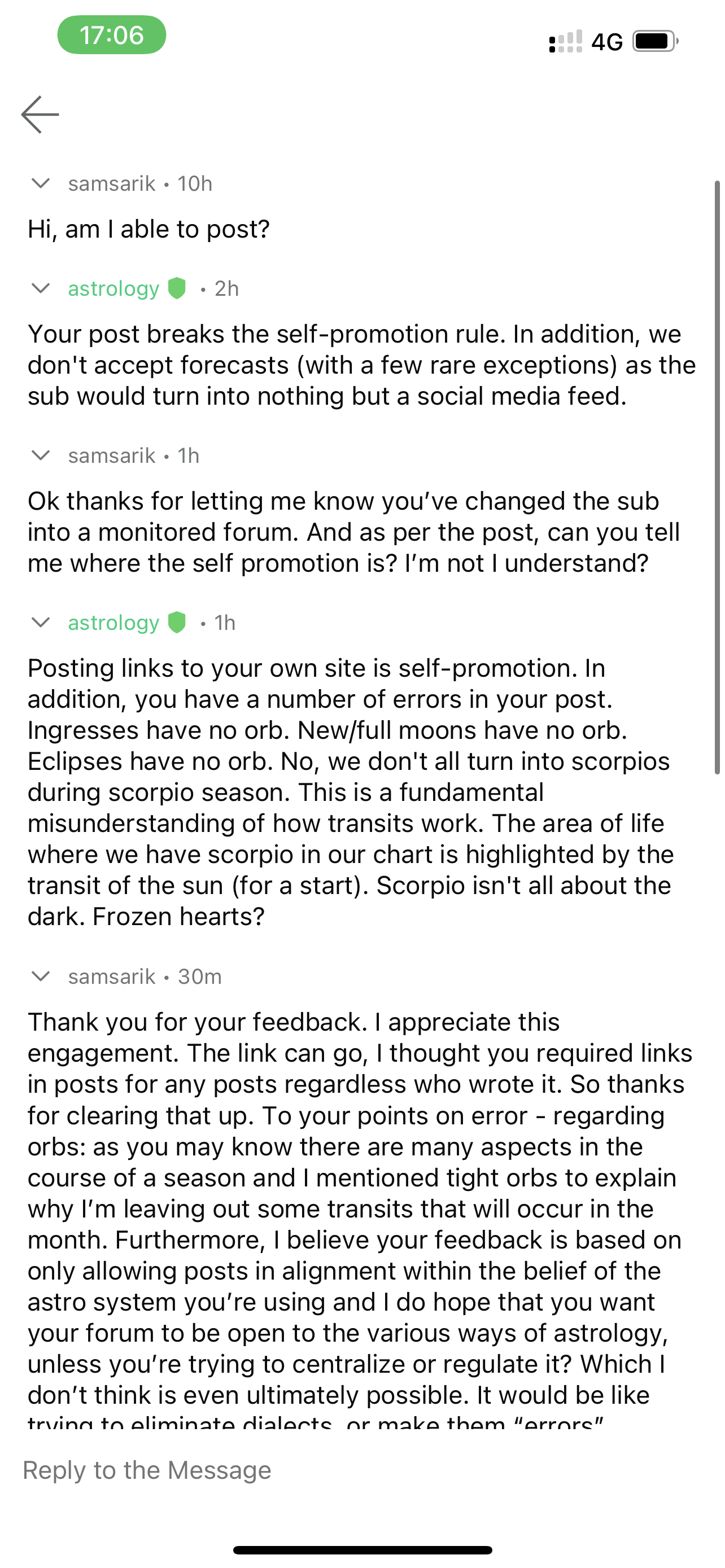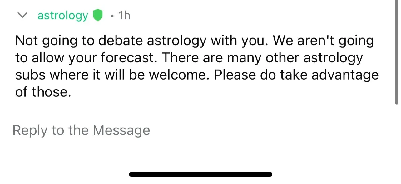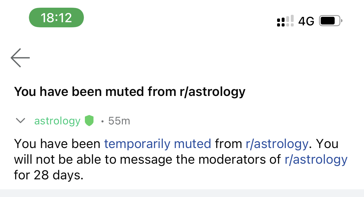 Hi everyone. I wanted to share my most recent exchange with the moderators on this sub. I love astrology and I love to share (without being anonymous) and it used to fly on this sub. 90 days ago I got muted so I stopped posting.